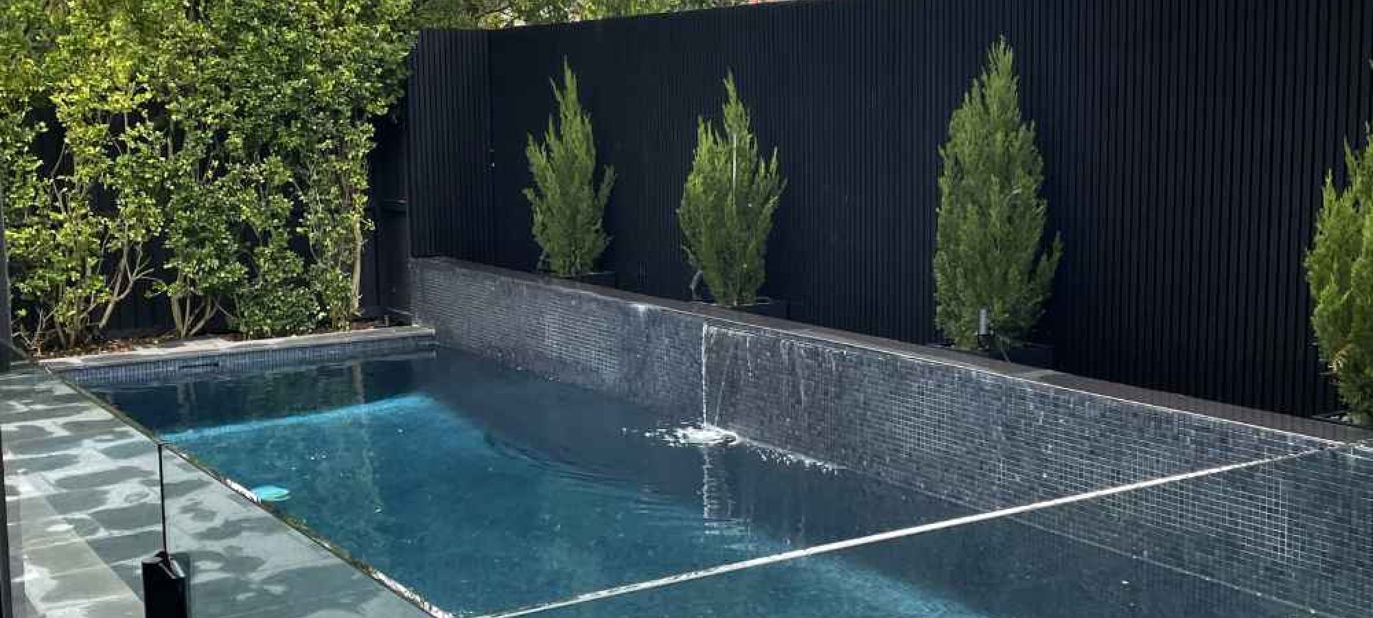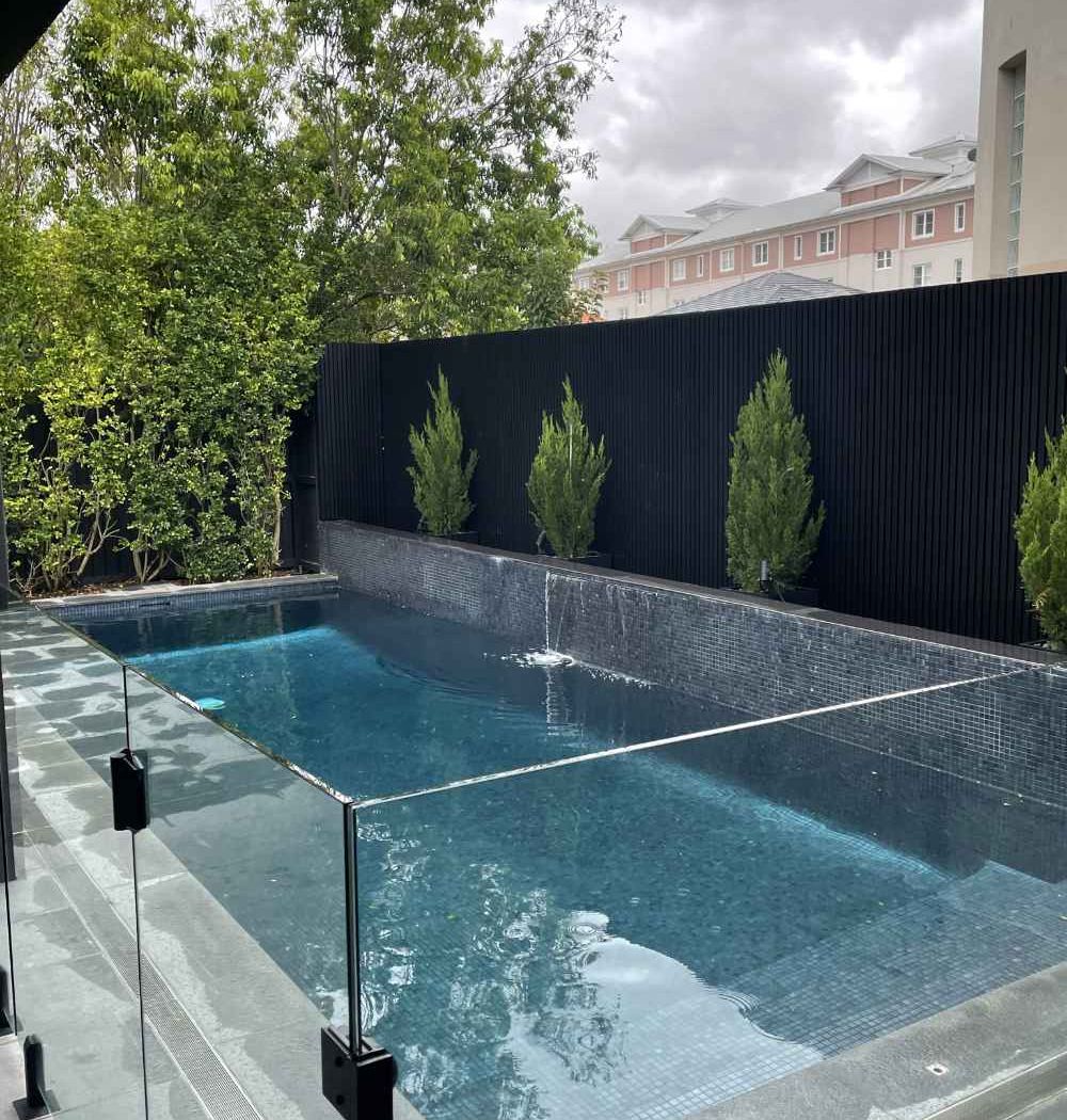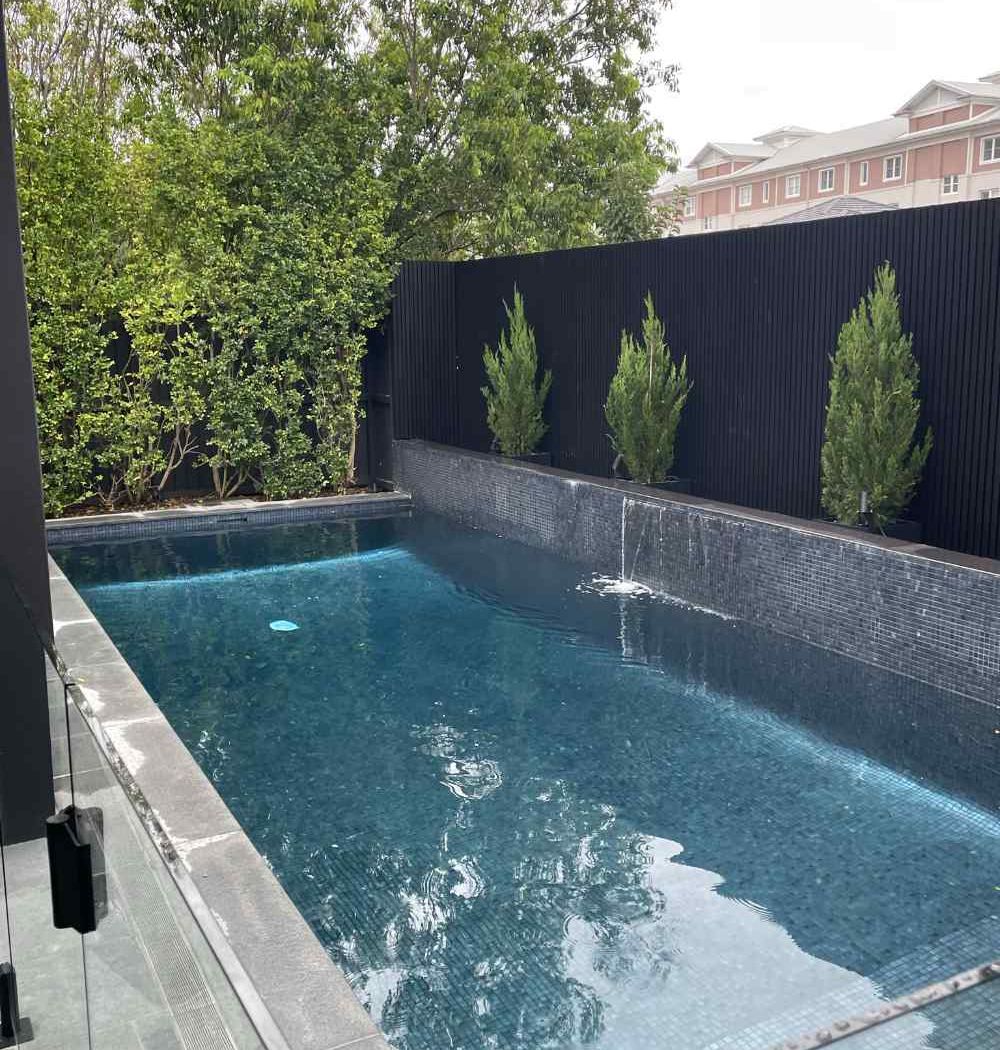 For this project, our vision was to transform a dated swimming pool into a contemporary backyard retreat. The sleek, dark-tiled interior forms a striking contrast with the surrounding greenery, while a subtle wall-mounted water feature introduces movement and a serene auditory element. The clear glass barrier fence preserves uninterrupted sightlines, enhancing the sense of openness and connection to the landscape. Each detail was thoughtfully considered from the precise alignment of paving and pool edges to the integration of the water feature, creating a sophisticated space that balances modern geometry with natural softness. The result is a refined outdoor sanctuary where design, craftsmanship, and the surrounding environment come together to create a serene, inviting escape.