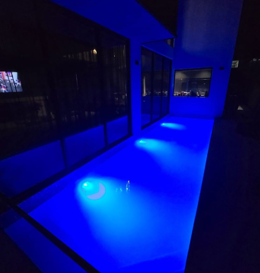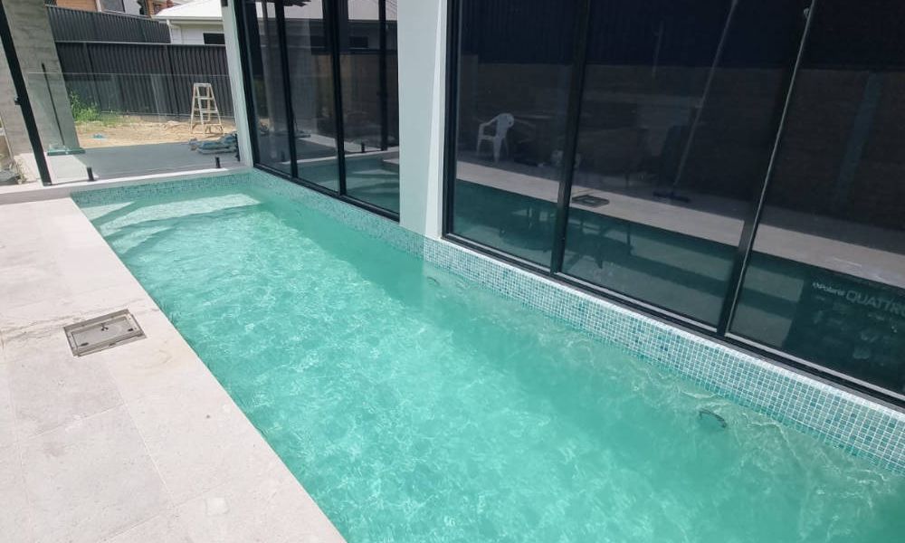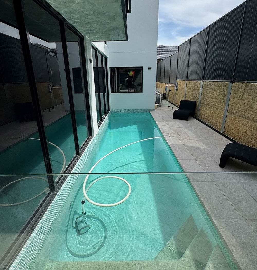 Our team transformed a compact backyard into a modern aquatic oasis. The narrow, rectangular pool features vibrant turquoise and light green mosaic tiles that catch the sunlight, creating a striking visual contrast against its crisp white concrete floor. Full-length steps with a unique diagonal edge add a subtle design twist, while the surrounding modern architecture and large glass panels enhance the sense of openness. A standout feature of this pool is its blue LED lighting, which not only improves night-time visibility but also transforms the space after dark, turning the bright daytime hues into a captivating deep blue ambiance. Every detail was carefully considered to craft a serene, inviting retreat that feels both contemporary and intimate.
