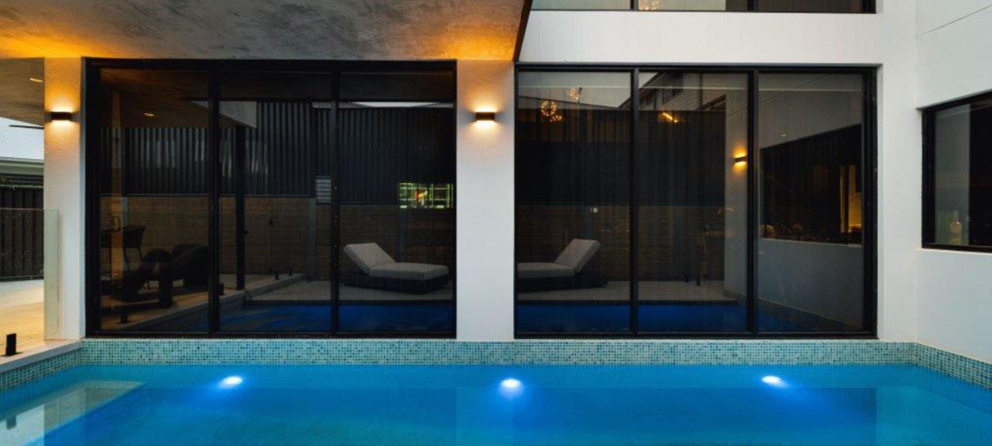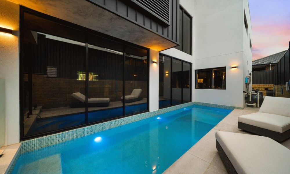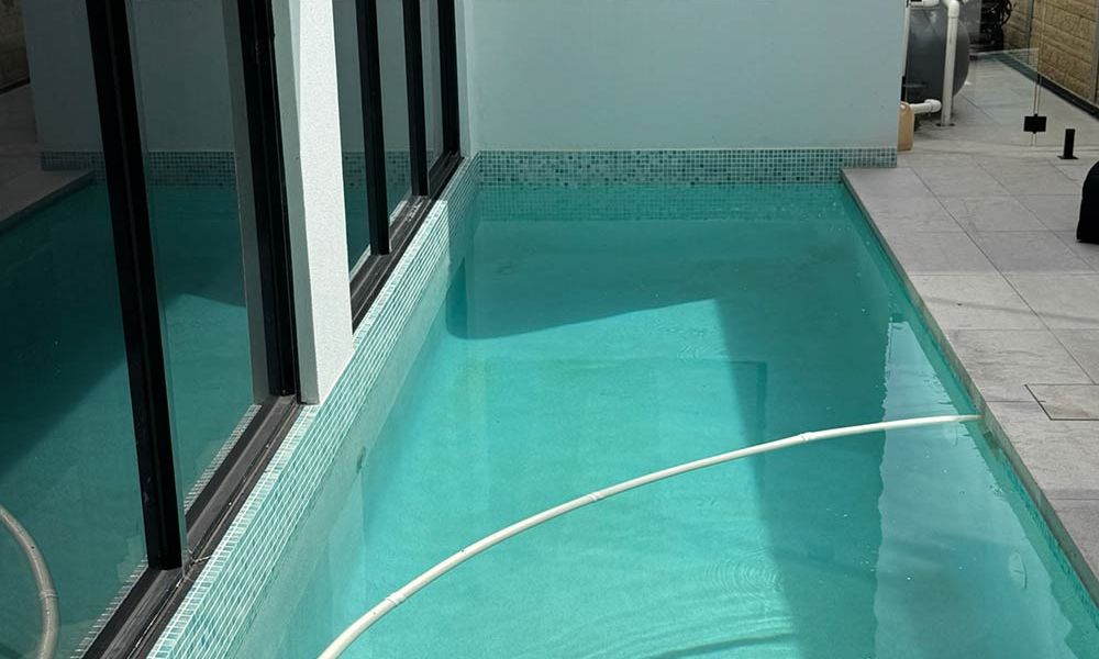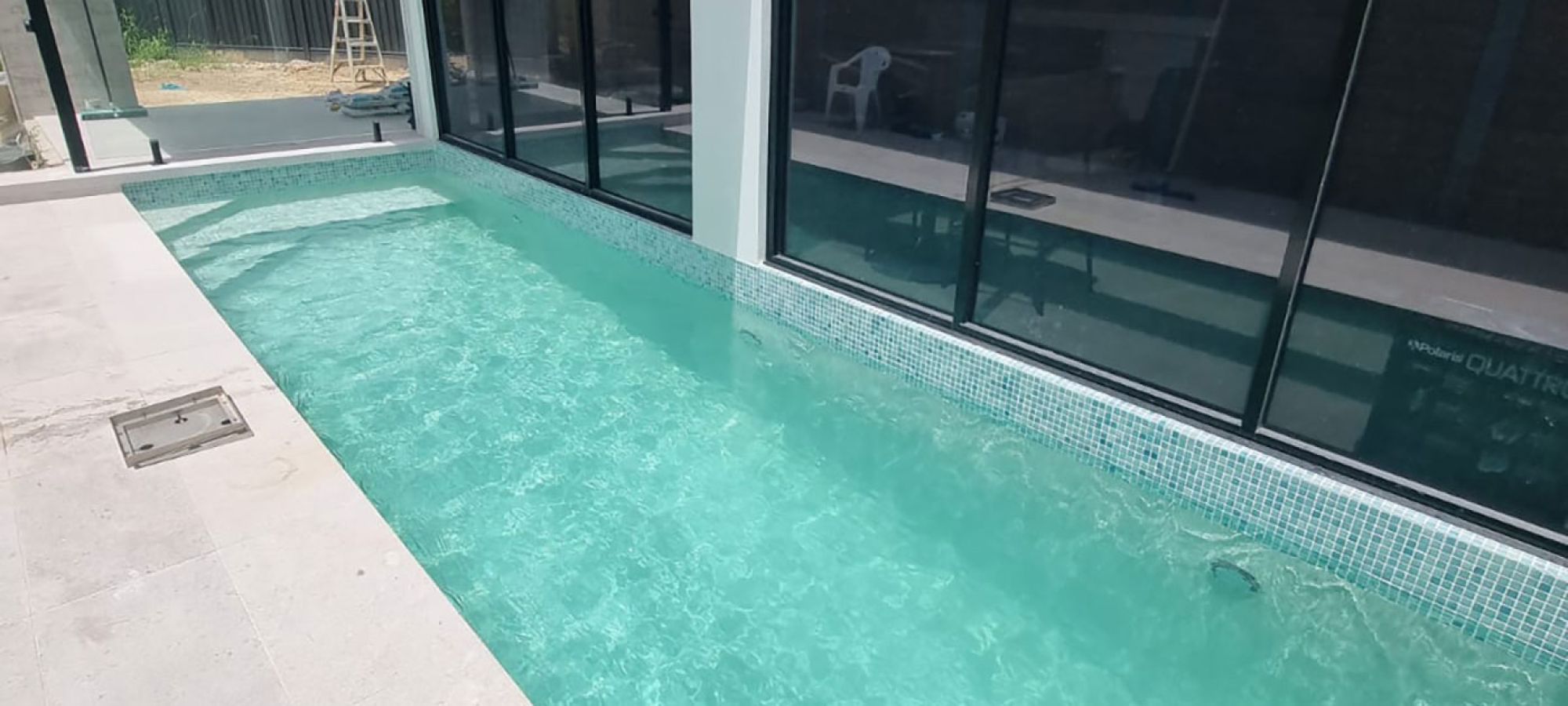 Our team transformed a compact backyard into a modern aquatic oasis. The narrow, rectangular pool features vibrant turquoise and light green mosaic tiles that catch the sunlight, creating a striking visual contrast against its crisp white concrete floor. Full-length steps with a unique diagonal edge add a subtle design twist, while the surrounding modern architecture and large glass panels enhance the sense of openness. A standout feature of this pool is its blue LED lighting, which not only improves night-time visibility but also transforms the space after dark, turning the bright daytime hues into a captivating deep blue ambiance. Every detail was carefully considered to craft a serene, inviting retreat that feels both contemporary and intimate.