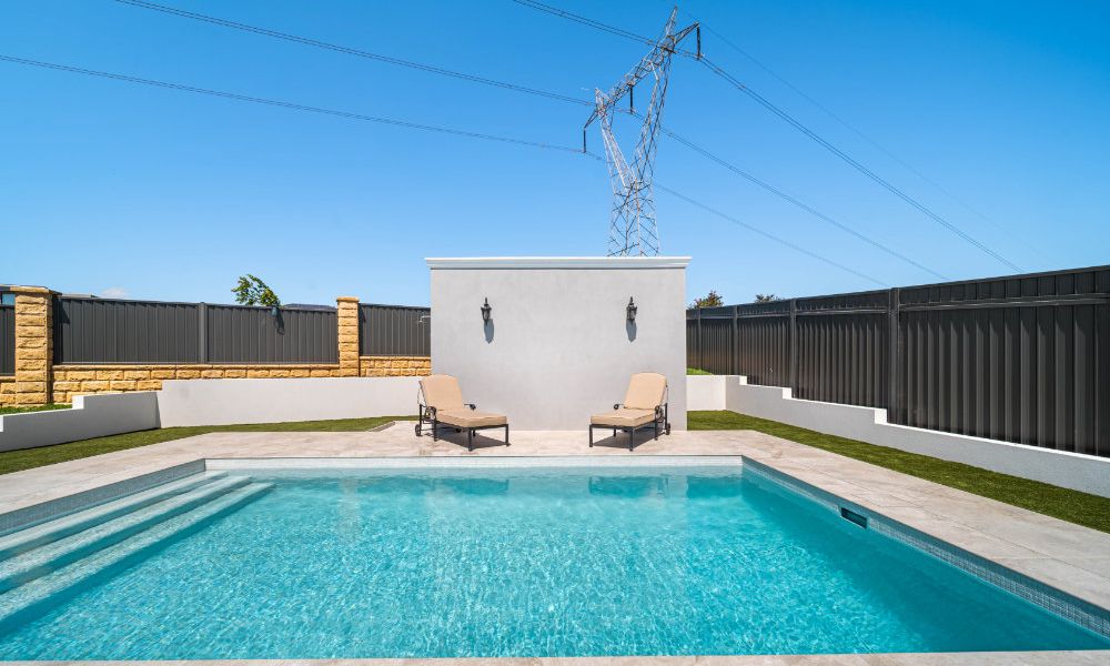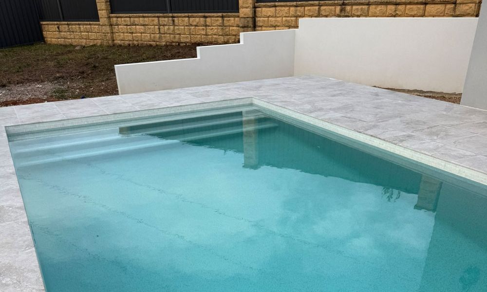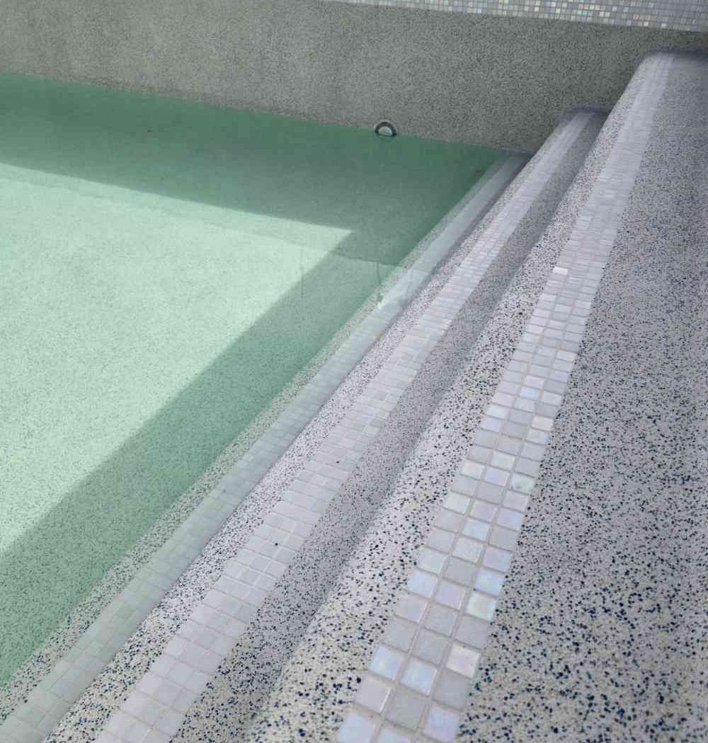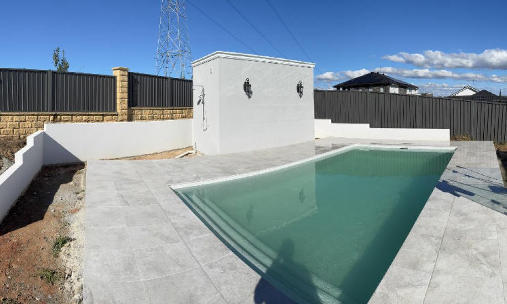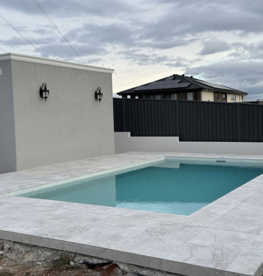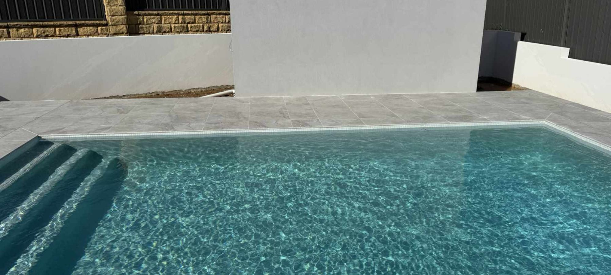 Our team created a sleek, modern outdoor pool area defined by clean lines and a light, contemporary palette. The rectangular pool features full-length steps edged with white mosaic tiles, and its interior is finished with a speckled aggregate for subtle texture. The design accentuates the vibrancy of the pool water, creating a visually engaging and inviting space. Grey-toned porcelain tiles surround the pool, seamlessly connecting the water to the patio. Matte black wall-mounted lights provide a striking contrast, drawing the eye without overpowering the soft, light tones of the design. The result is a harmonious, visually engaging space where every detail from custom concrete construction to precise tile placement contributes to a refined and inviting backyard retreat.